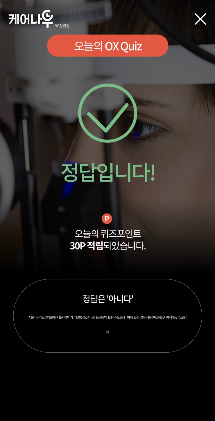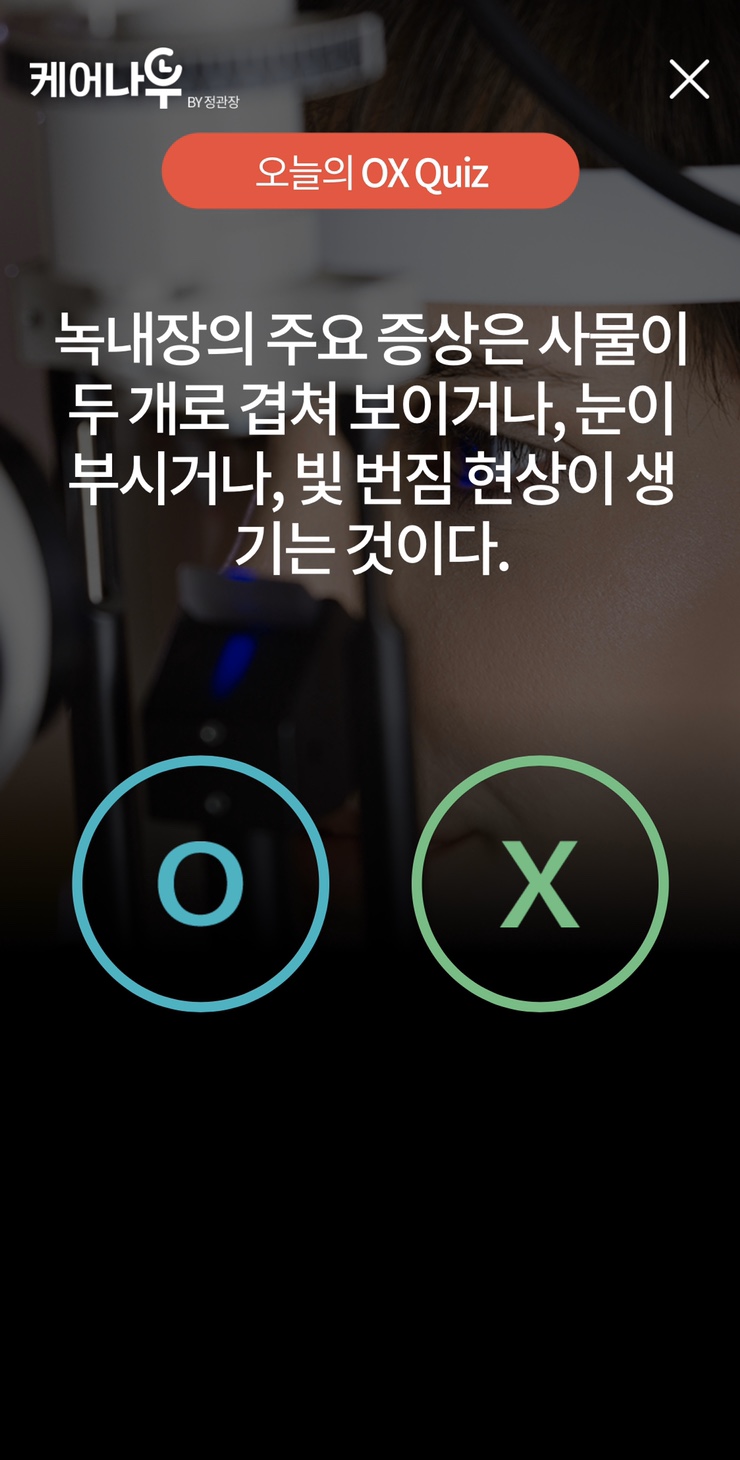 둘로 겹쳐 보이거나 눈이 부시거나 빛이 번지는 것이다?! 2/5 케어나우 퀴즈-녹내장의 주요 증상은 사물이